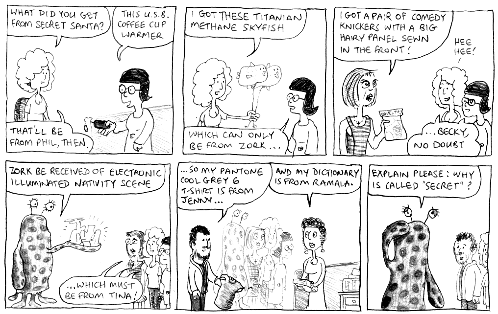 What did you get from Secret Santa? This U.S.B. coffee cup warmer. That'll be from Phil, then. I got these Titanian methane skyfish. Which can only be from Zork ... I got a pair of comedy knickers with a big hairy panel sewn in the front! *hee hee!* ... Becky, no doubt. Zork be received of electronic illuminated nativity scene ... which must be from Tina! ... So my Pantone Cool Grey 6 t-shirt is from Jenny ... and my dictionary is from Ramala. Explain please: why is called "secret"?