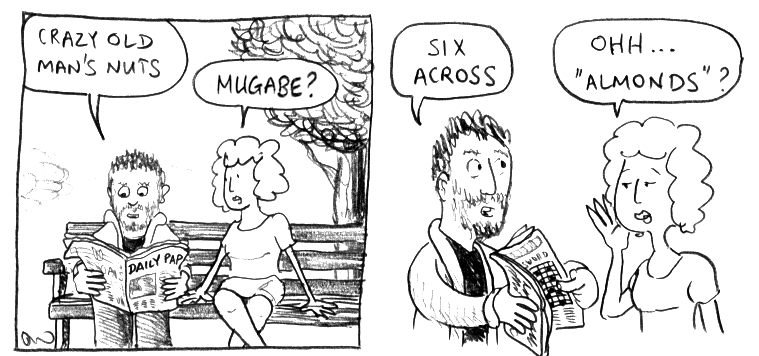 Crazy old man's nuts. Mugabe? Six across. Ohh ... "almonds"?