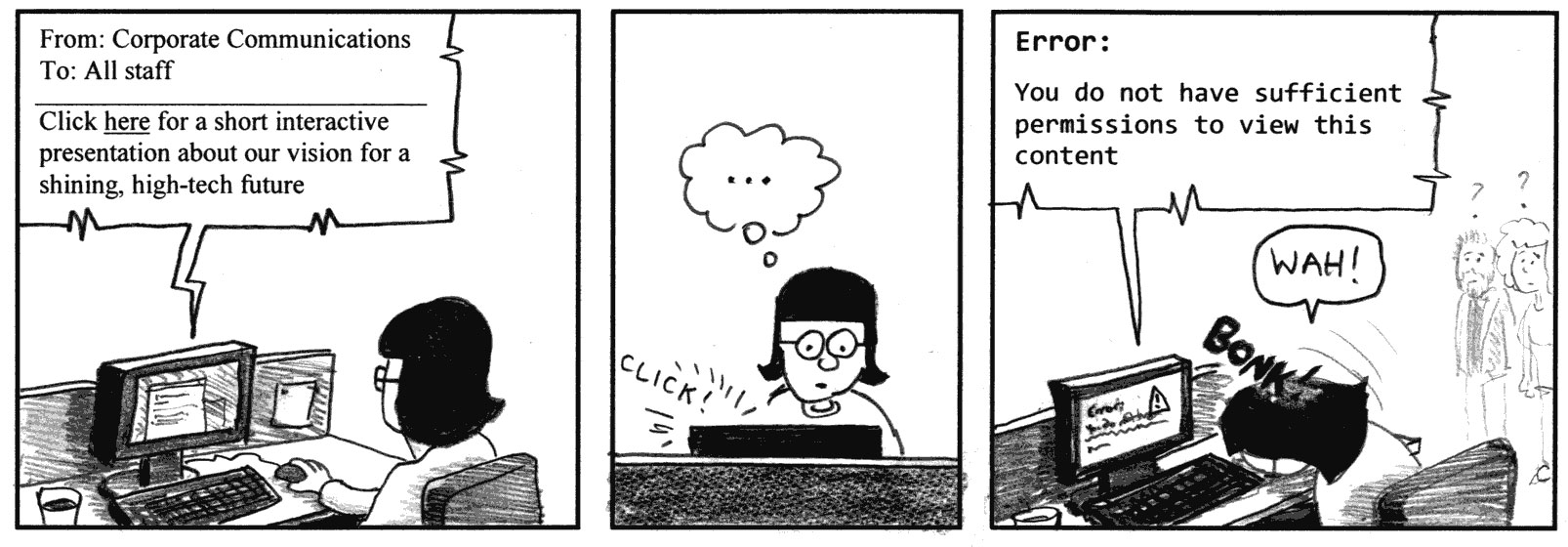 From Corporate Communications. To All staff. Click here for a short interactive presentation about our vision for a shining, high-tech future. *click!* ... Error: You do not have sufficient permissions to view this content. Wah!